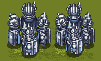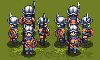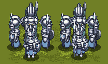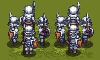The character Sprite animation is based on 48 high-resolution base drawings of guard characters. This animation consists of 6 frames and is divided into two groups: standby and walking animations. The guard character's armor is graded from Lv1 to Lv5, making this animation suitable for RPG or APRG games.